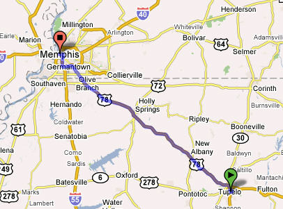 This leg took us through Tupelo, MS and then on to Memphis, TN. We had to stop in Tupelo since this was the birthplace of Elvis Presley. We got fuel, unhooked our Honda CRV and set off to find Elvis birthplace. Tupelo is a very small place and so we had no problem finding it. It was hard to believe that his birth house was actually smaller than our motor home!